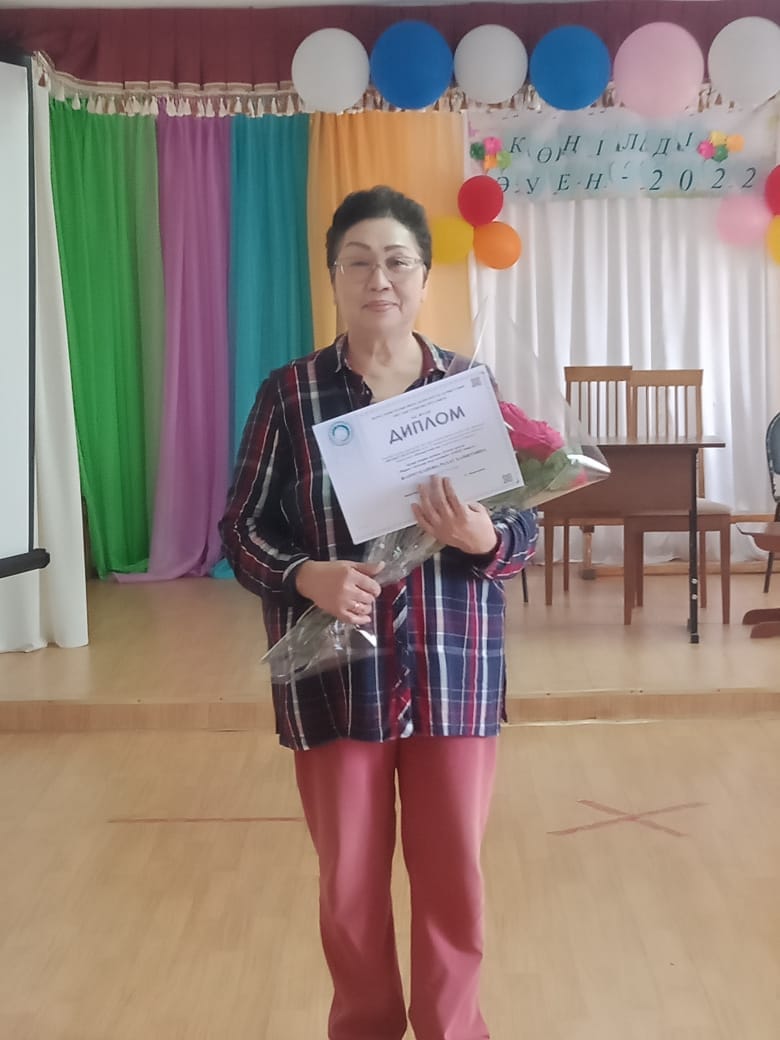 Диплом. «Данышпан» республикалық қашықтық байқаулар орталығының ұйымдастыруымен өткен «Арайлы алтын күз» атты шығармашылық байқауына жеңімпаздарды дайындағаны үшін.2021ж.