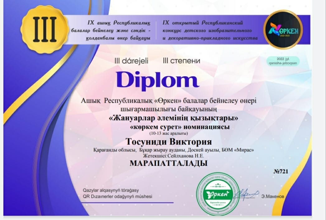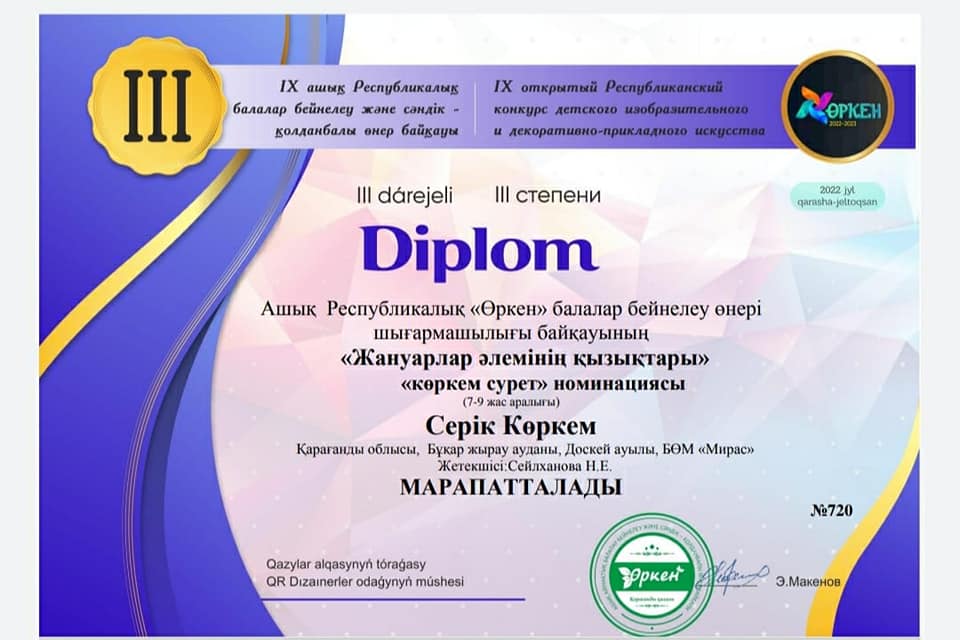 Ашық Республикалық «Өркен» шығармашылық байқауынан Серік Көркем III-орын, Адишева Мадина II-орын, Тосуниди Виктория III-орындарға ие болды.