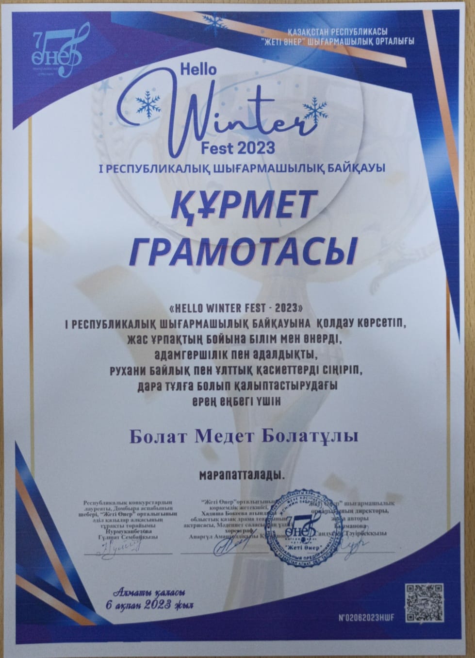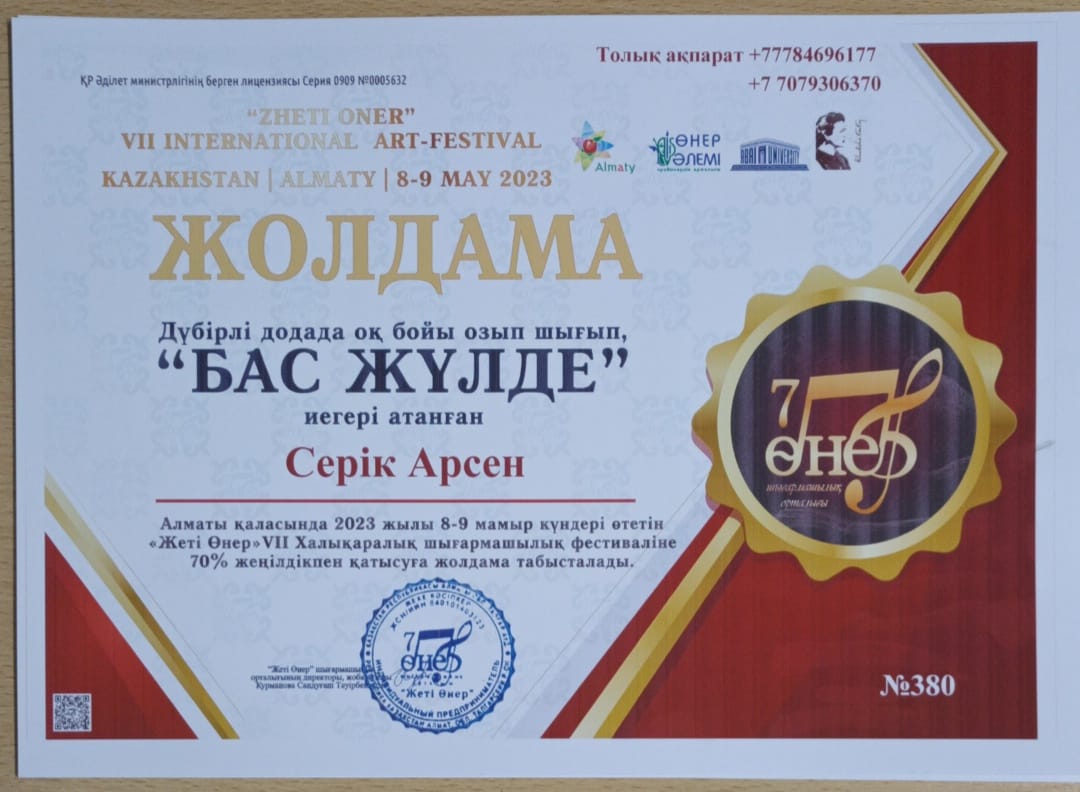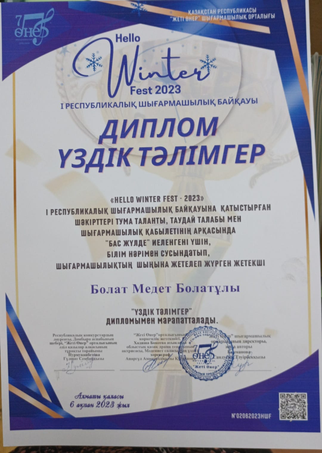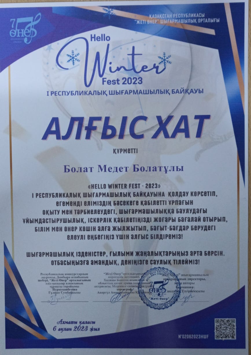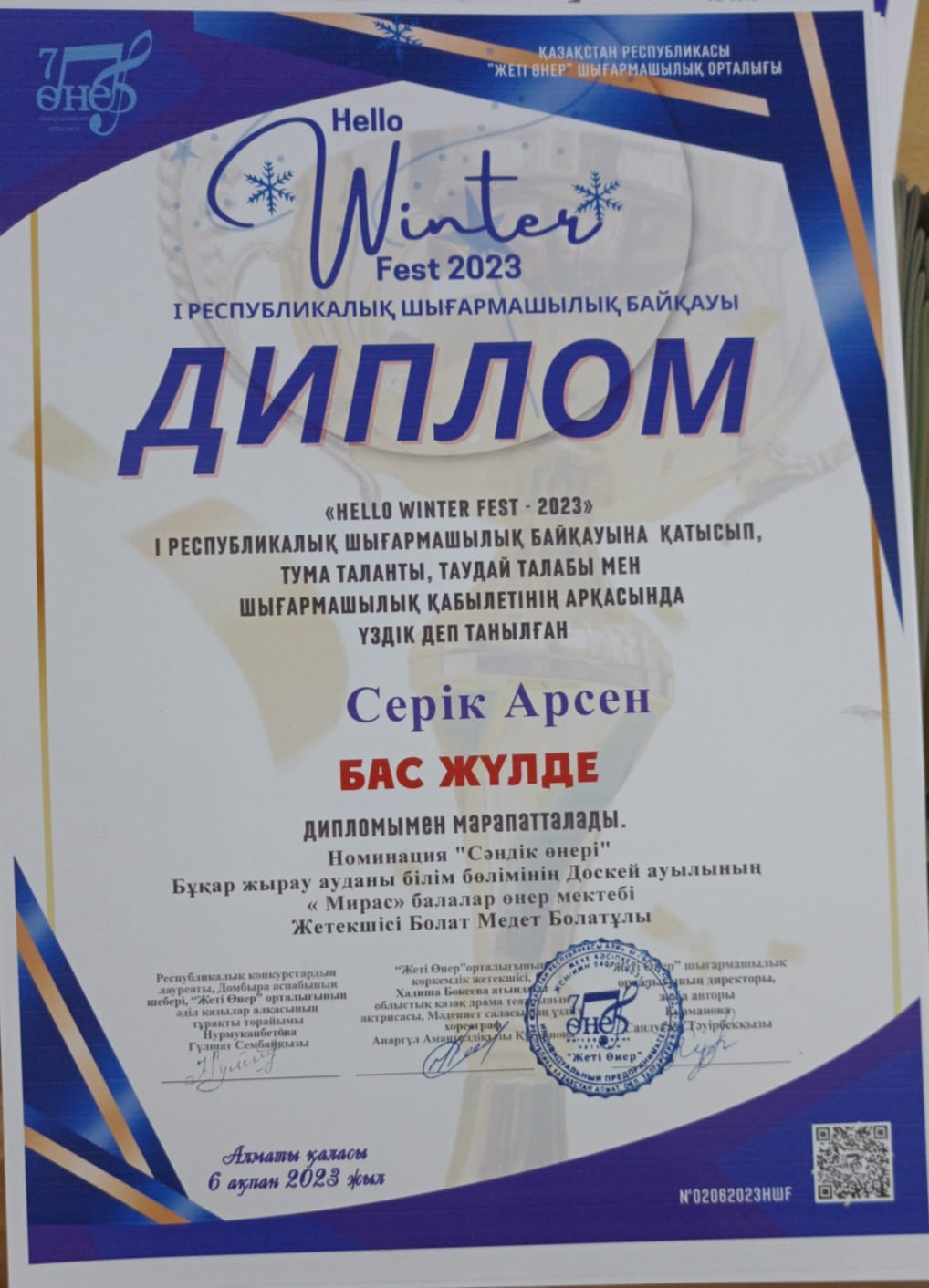 ҚР "Жеті өнер" шығармашылық орталығы ұйымдастырған Winter Fest 2023 I Республикалық шығармашылық байқауына, Доскей ауылының "Мирас" балалар өнер мектебінің, Қарақұдық филиалындағы Сәндік • қолданбалы өнер "Мауелі ағаш" сыныбының оқушылары жүлделі орындарға ие болды. Бас жүлде- Серік Арсен I- орын Махин Айдос Оқытушысы: Медет Болатұлы. Жеңістеріңіз құтты болсын!!
