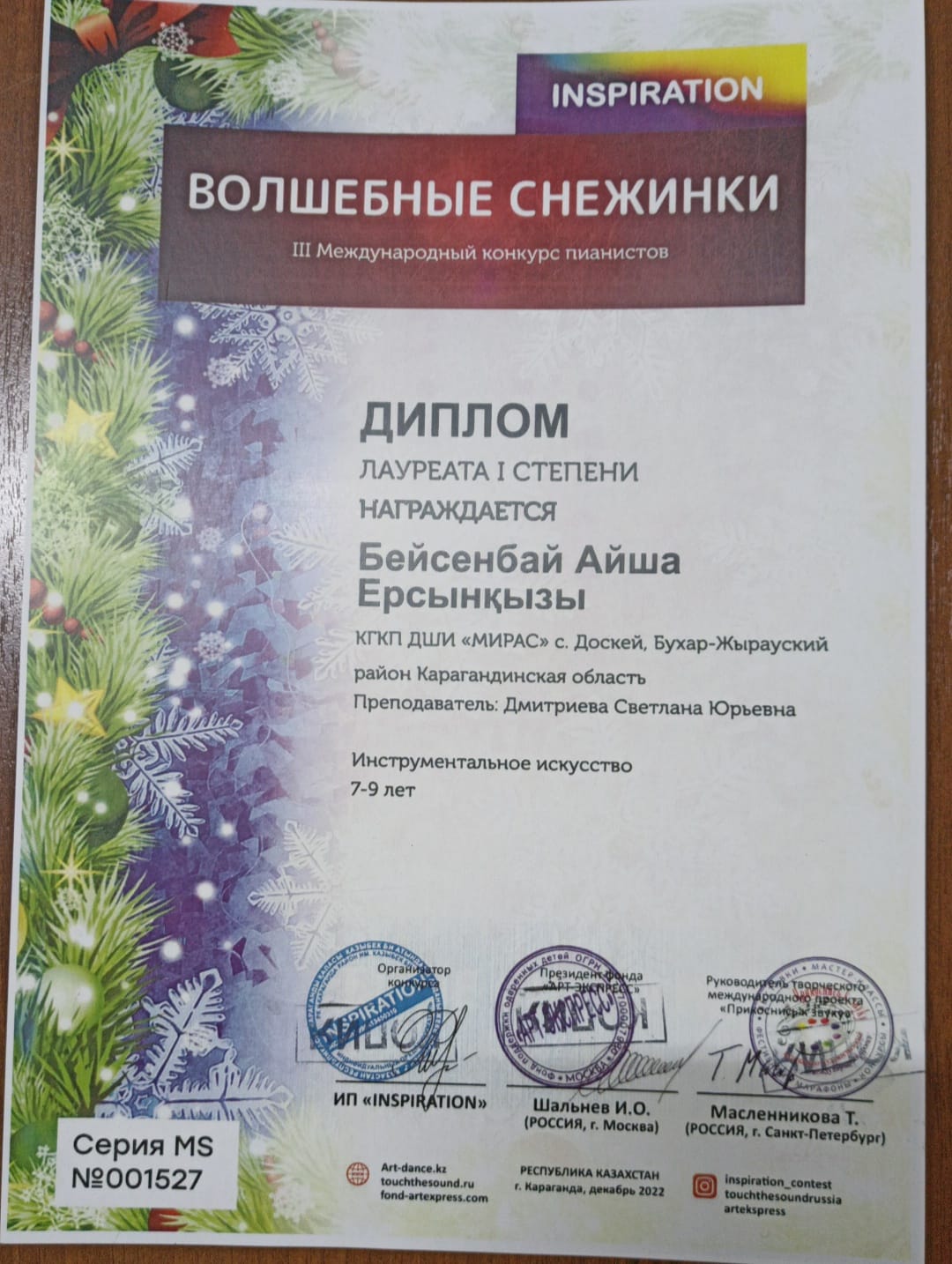 Доскей ауылының «Мирас» балалар өнер мектебінің фортепиано сыныбының оқушысы Бейсенбай Айша III- Халықаралық пианистер байқауынан жүлделі I- орынға ие болды.